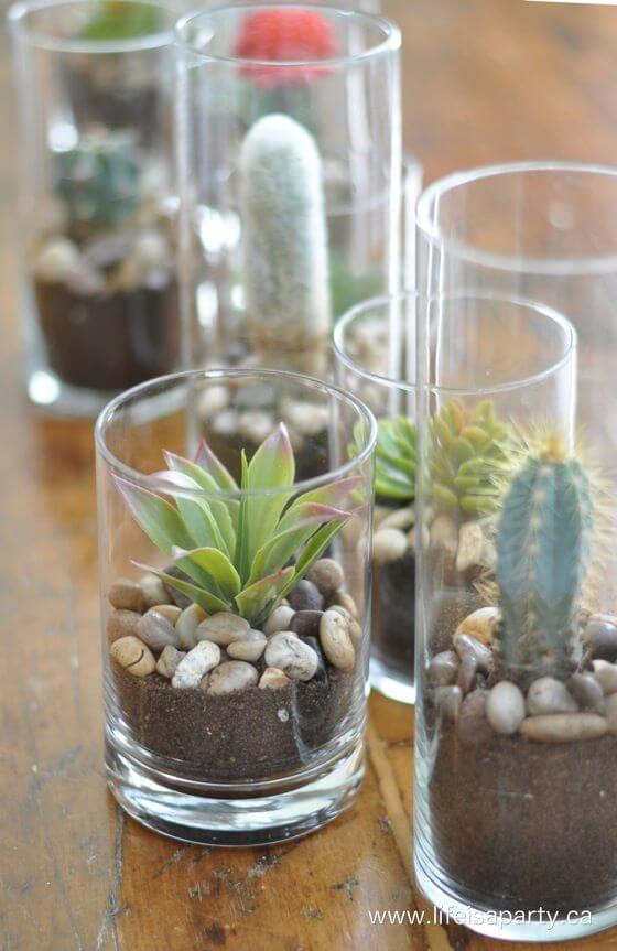 This is a great way to reuse glassware and turn it into beautiful decor pieces. Just add a bit of sand or cactus soil, gently plant your succulent, and finish with a handful of smooth pebbles on top.