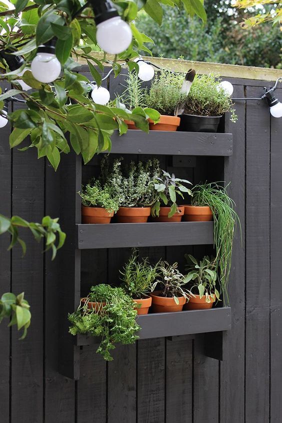 Deep shelves keep terracotta pots secure while highlighting the vibrant textures of herbs and leafy plants. You can mount it directly on the fence to give your garden a clean, organized backdrop.