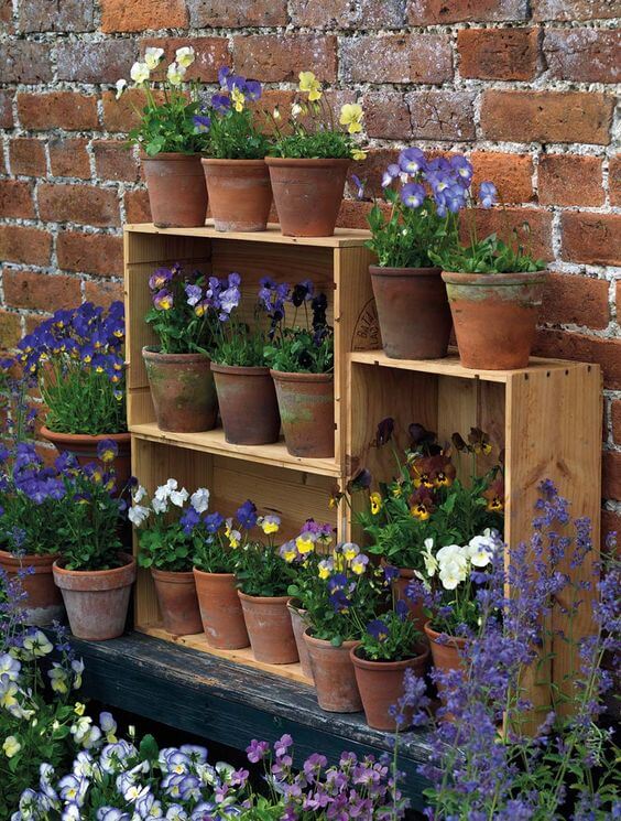 This charming display uses simple wooden crates turned on their sides to craft a rustic and layered planter shelf. The setup lets terracotta pots nestle neatly while giving each bloom plenty of sunlight and visibility.