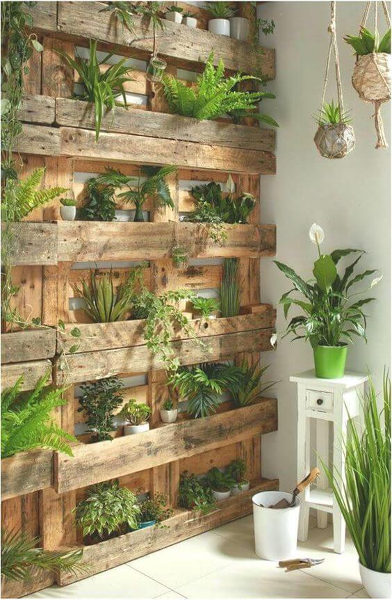 These rustic pallet shelves create a lush vertical garden that breathes life into any bare wall. Their weathered wood brings raw charm, making greenery pop in contrast.