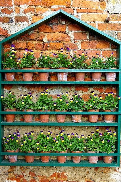 This charming house-shaped planter shelf turns any wall into a blooming showcase. The crisp green frame pops against aged brick and offers five full rows to display vibrant flowers in classic terracotta pots.