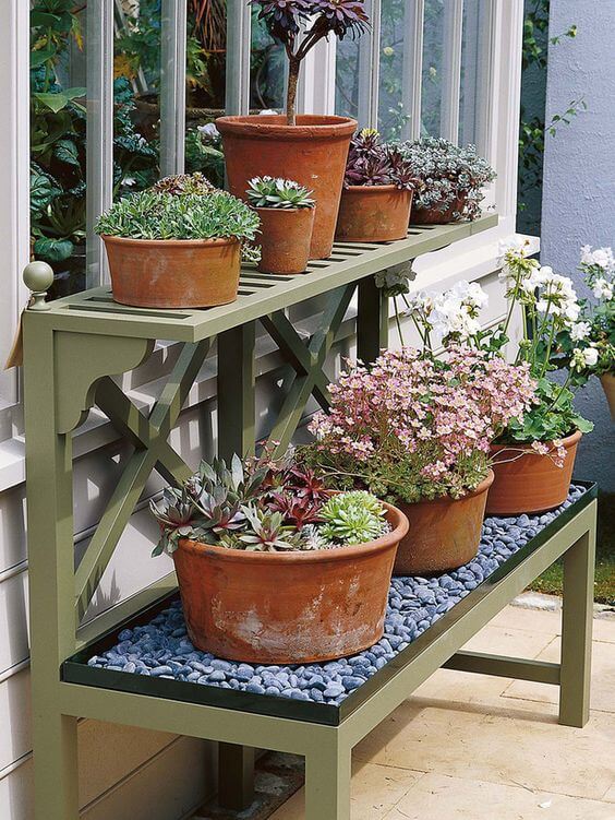 Pebbles on the bottom layer create a clean, textured base that highlights the terracotta pots beautifully. You can place it along a sunny wall to make the most of natural light and give your plants a happy home.