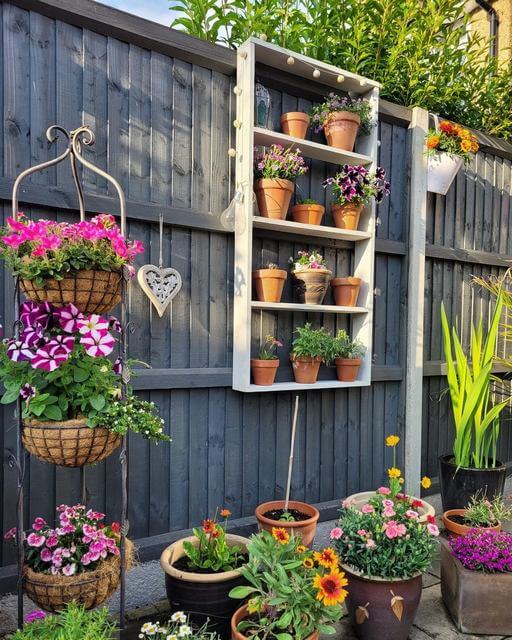 This creative garden display proves that vertical space can be just as lush and charming as the ground below. A repurposed white shelf pops against the dark fence, bringing depth and contrast while letting the colorful blooms shine.