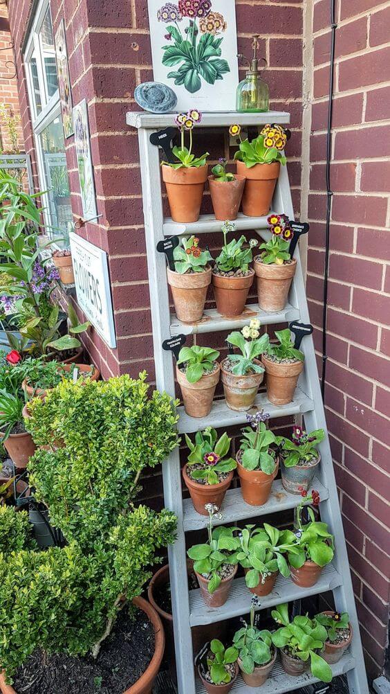 An old ladder becomes a charming vertical garden, giving a nostalgic and rustic feel to this cozy corner. Each step holds aged terracotta pots filled with vibrant primulas, and their soft blossoms peek out like little painted faces.