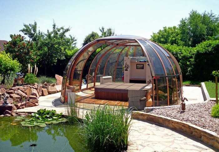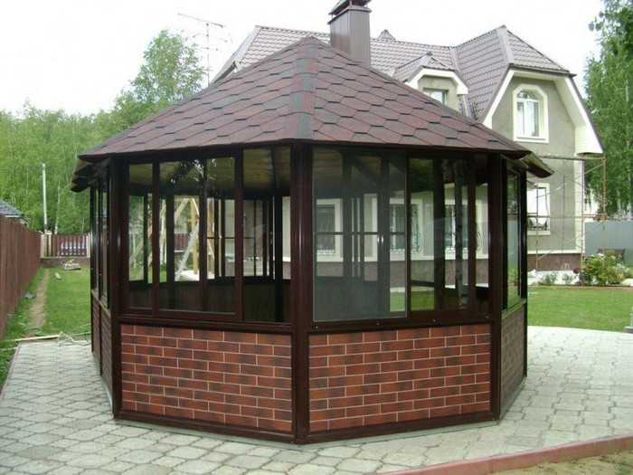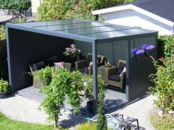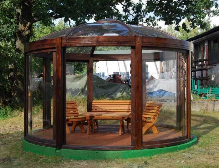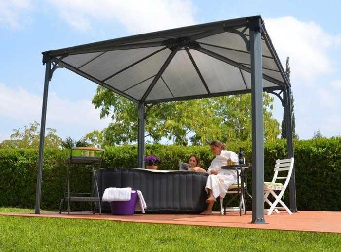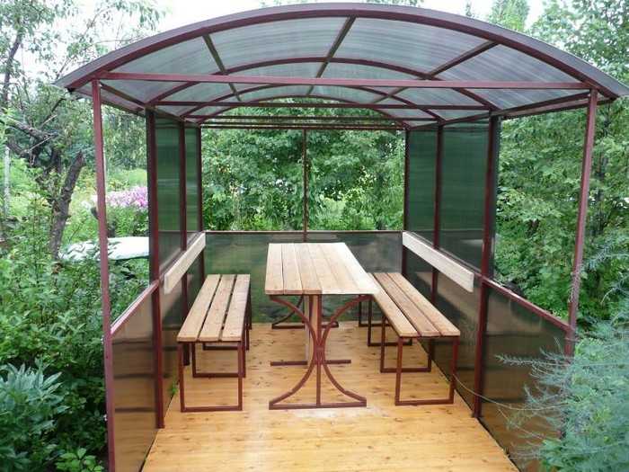 Polycarbonate. Ce matériau gagne en popularité parmi les jardiniers qui souhaitent créer un endroit spectaculaire et élégant pour se détendre sur leur site. En fonctionnement, le polycarbonate est assez léger et maniable, mais une telle structure ne sera pas durable. Cela est dû à la durée de vie limitée du matériau : il sèche sous l’influence de la lumière directe du soleil et des fissures.