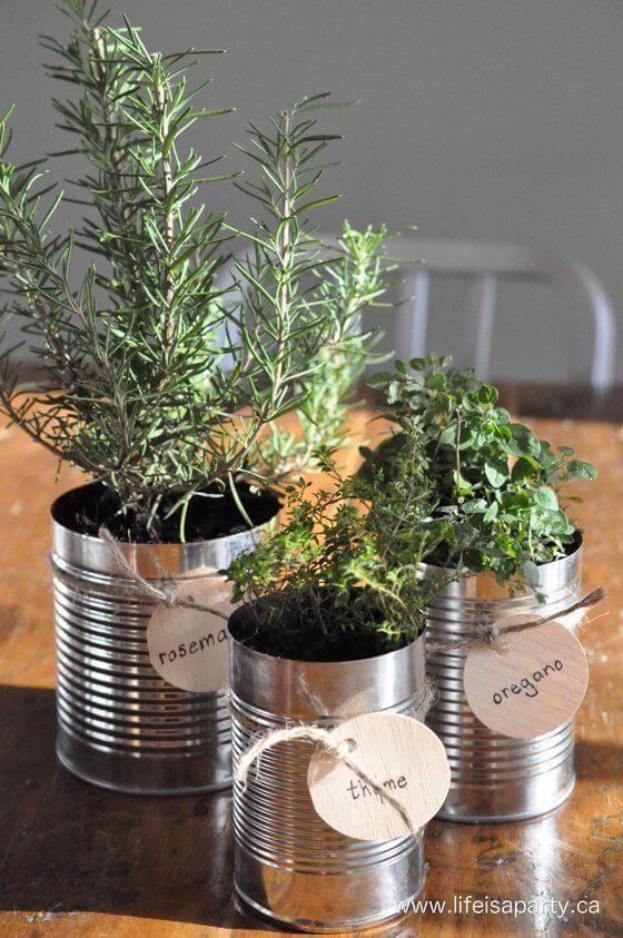 You can reuse what you already have in the kitchen. Just clean them, punch a few drainage holes at the bottom, and fill them with potting soil. Label each one with twine and handmade tags for that homemade touch.