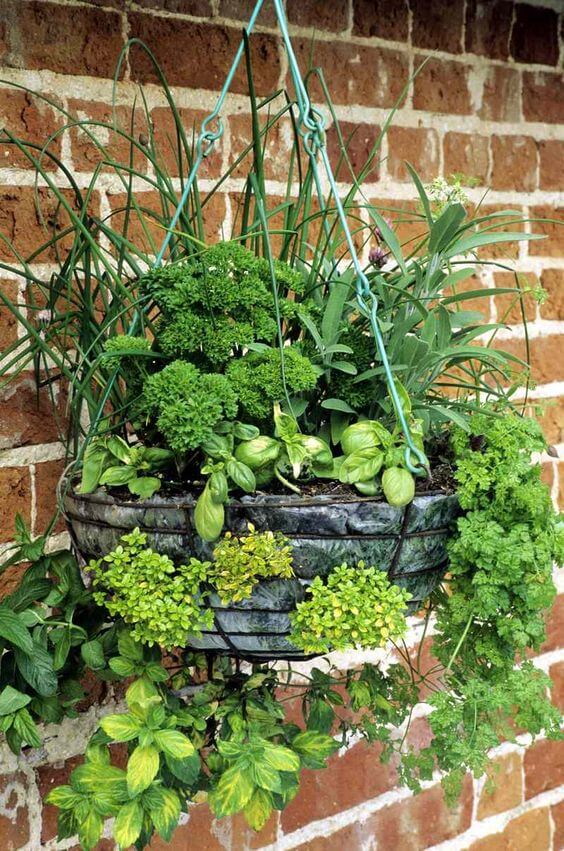 This lush hanging herb garden is perfect for patios or balcony walls. It combines basil, parsley, chives, oregano, sage, and mint in a single suspended planter.