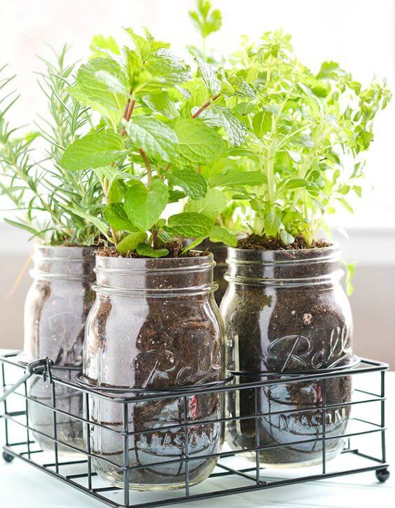 Just add a layer of pebbles at the bottom of each jar for drainage, then fill with high-quality potting mix and your favorite herbs, mint, basil, and rosemary. All do well in this environment.