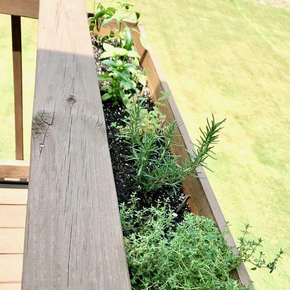 This narrow, sun-drenched railing box makes use of space you might normally overlook. It’s ideal for herbs like rosemary, thyme, and basil plants that crave full sun and good drainage.