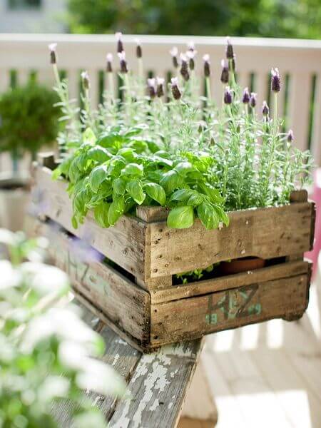 An old wooden crate’s filled with lush basil and sprigs of lavender, two herbs that love the sun and offer both culinary and aromatic benefits.