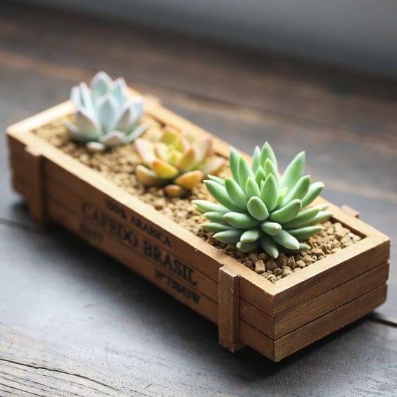 Small wooden boxes make rustic and stylish planters for desk gardens. Fill them with a variety of succulents for color and texture. Add gravel at the base for proper drainage.
