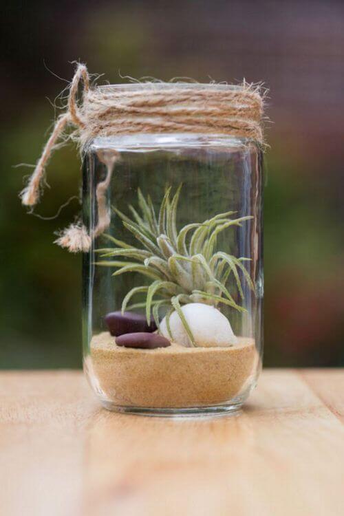 A clear jar makes a minimalist home for an air plant. Add a little sand or tiny pebbles at the bottom for stability. Air plants inside jars need occasional misting but no soil at all.