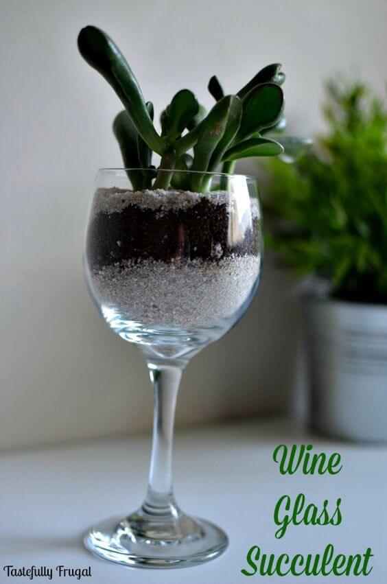 Old wine glasses can be turned into creative mini succulent planters. Their tall shape adds elegance to any desk setup. Layer small stones at the base before adding soil.