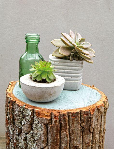 Hollowed-out logs bring a woodland feel to your desk garden. Plant succulents inside the carved space and top with moss for a natural touch. Logs hold moisture well and create a unique rustic planter.