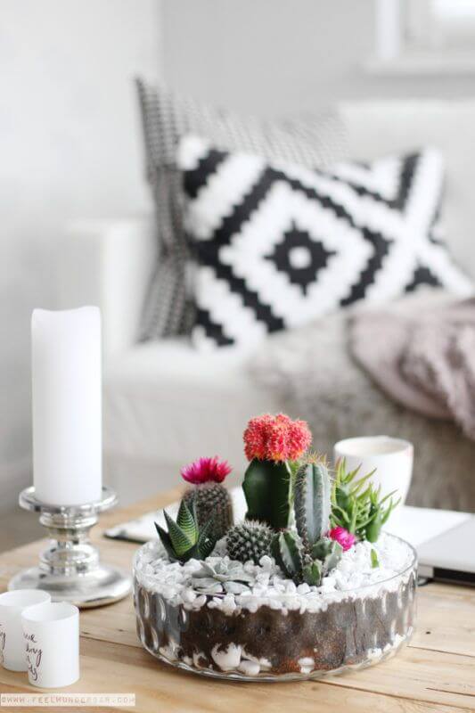 Add decorative gravel to highlight the cactus shapes. Cacti need plenty of sunlight, so place them near a bright window. Their unique forms bring character to your space. With little care, they’ll thrive for years.