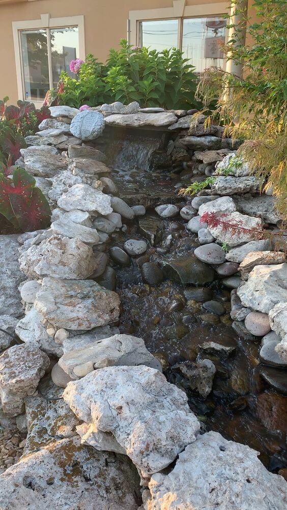 A flowing stone river like this creates a striking feature that instantly elevates the front yard. The clear water gently moving through smooth pebbles brings both beauty and a sense of calm to the space.