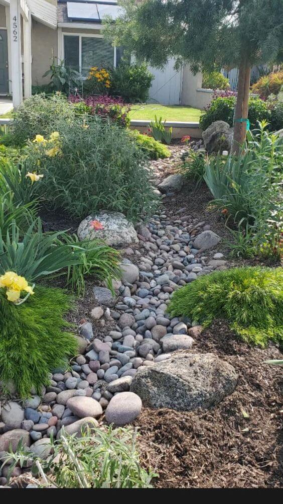 To recreate it, dig a shallow trench, lay down landscaping fabric, and fill it with assorted stones. Plant colorful flowers and greenery along both sides to frame the “river” beautifully.