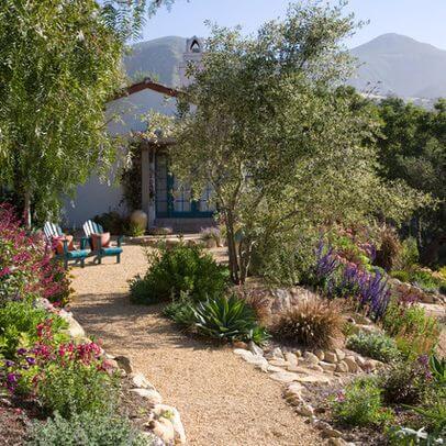 This Mediterranean-inspired garden feels warm, rustic, and full of life. The gravel pathway, framed with stones, gives it an earthy charm that pairs beautifully with olive trees, lavender, and sun-loving plants.