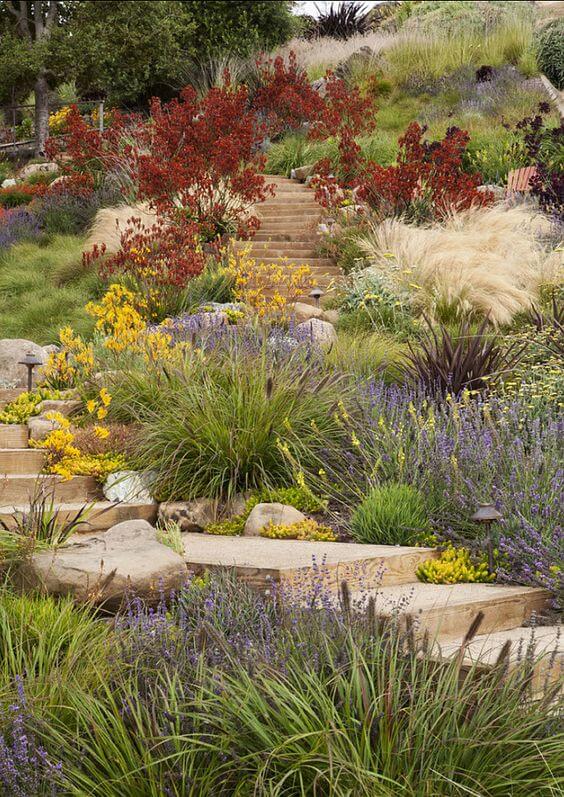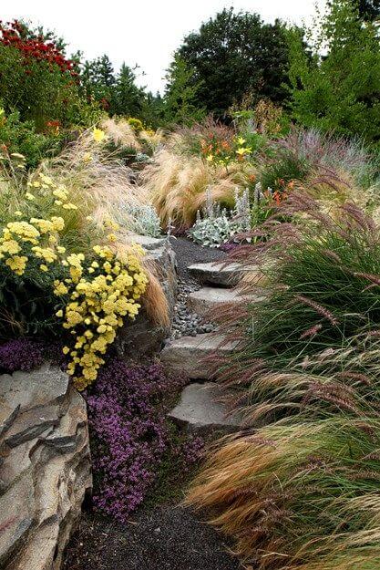 This design turns a simple hillside into a breathtaking garden scene. The stone steps guide you upward while being surrounded by swaying ornamental grasses and colorful flowering plants.