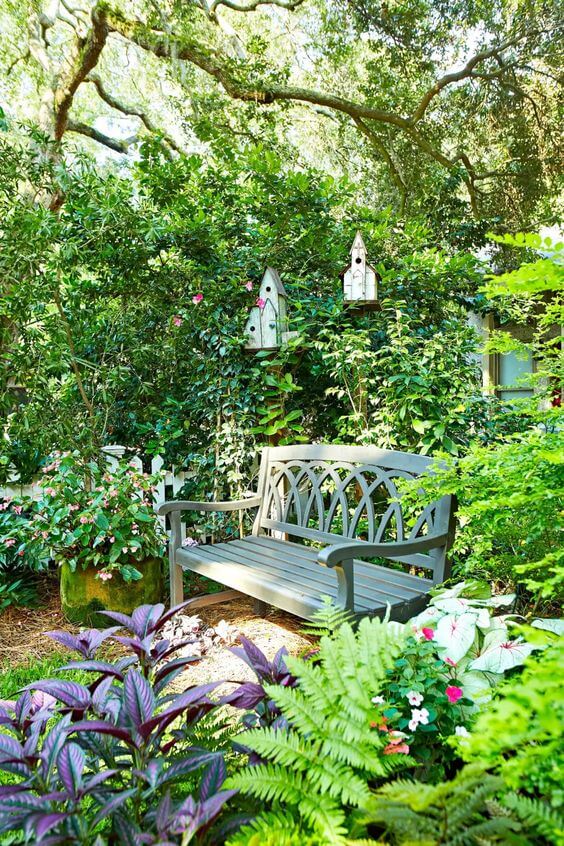 To recreate this tranquil spot, choose a sturdy garden bench that complements your existing greenery. You can easily add a few decorative elements, like these delightful birdhouses, to personalize your own cozy corner.