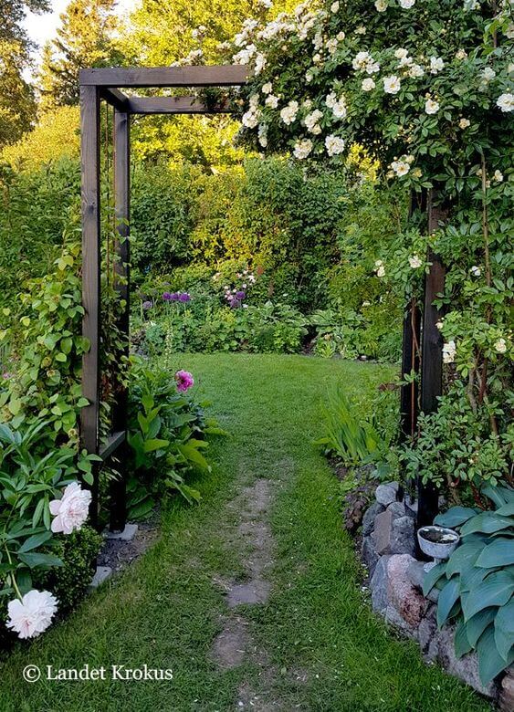 This enchanting view shows how a simple, dark-stained wooden gate or arbor can create a magical entrance into the deeper parts of your cottage garden. The tall, dark structure provides a beautiful contrast to the bright green grass path and the soft white roses climbing over the top.