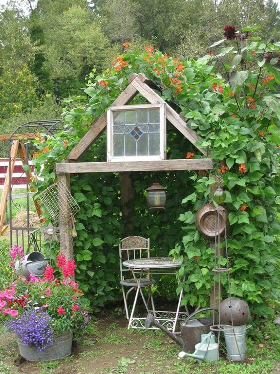 You can enhance the whimsical feel by hanging antique gardening tools and a simple lantern from the wooden frame. To build a similar garden bean house, construct a simple A-frame and then plant the climbing seeds all around the base of the structure.