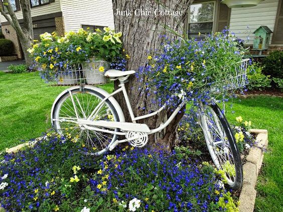 This delightful image perfectly captures the whimsy of cottage style with an ingenious upcycling bicycle planter idea. A vintage bicycle, painted bright white, is propped up against a tree, instantly becoming a charming focal point in the garden.