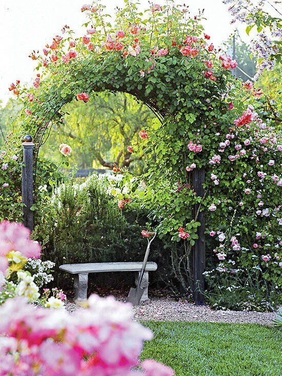 Notice how the gravel path and the low hedge of rosemary help define this tranquil sitting area. To achieve this stunning floral effect, choose a hardy climbing rose variety that thrives in your climate and train its canes along the arch structure.