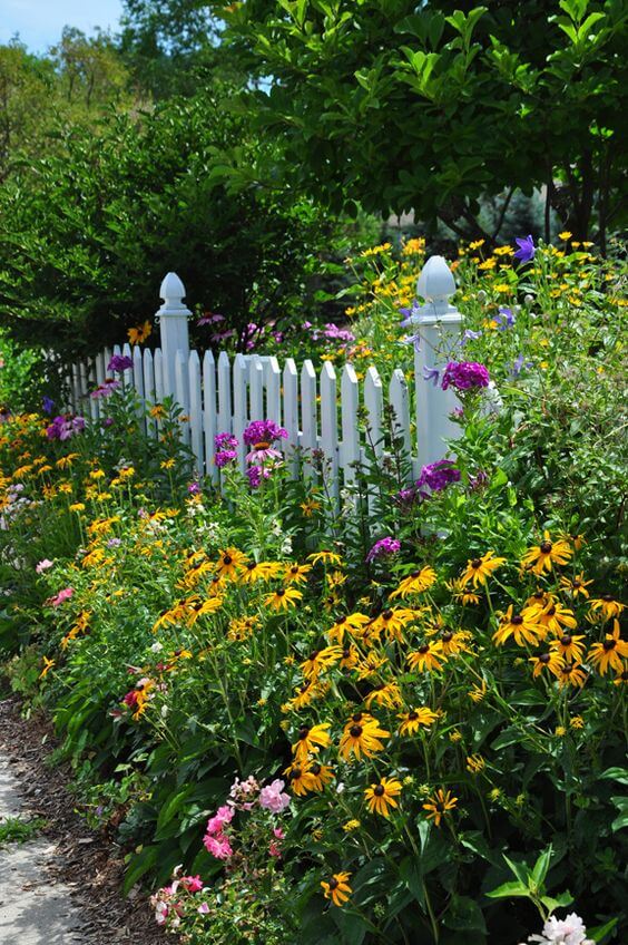 The border is overflowing with a beautiful, informal mix of sunny yellow Black-Eyed Susans, tall purple blossoms, and various pink flowers. This layered planting style creates a wonderful sense of depth, giving you something lovely to look at from every angle.