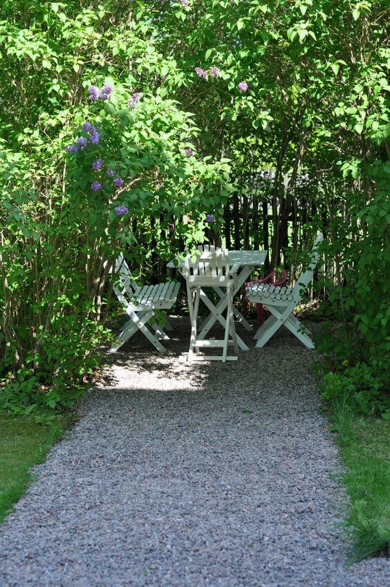 The crunching pea gravel path leading up to the table adds a charming, rustic touch typical of beautiful cottage gardens. The dense greenery completely surrounds you, making this the perfect hidden spot for quiet reading or an afternoon tea.