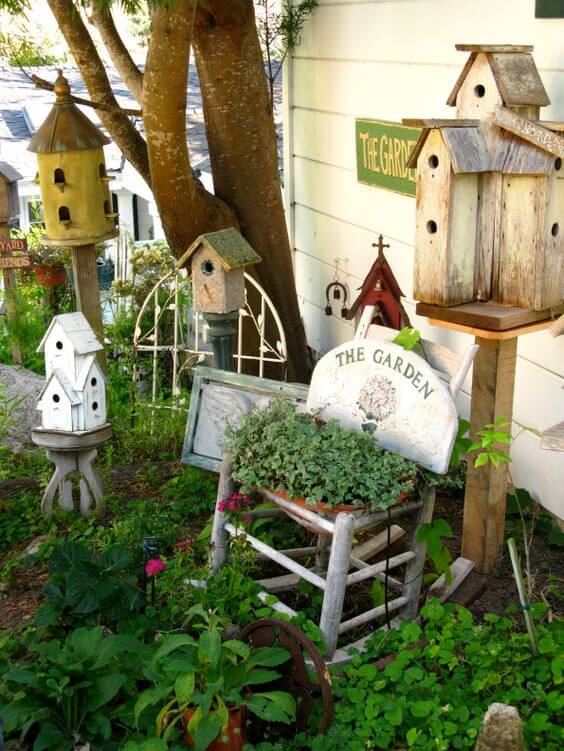 This delightful corner truly exemplifies a Recycled Garden with Plants, blending repurposed objects with lush greenery to achieve maximum cottage charm. Several unique, rustic birdhouses are clustered together, providing fantastic vertical interest and a whimsical, lived-in feel to the display.