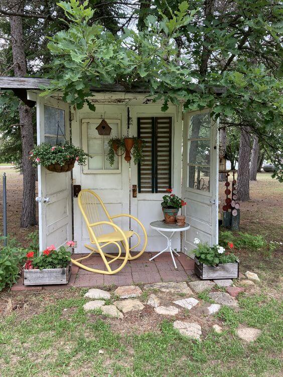 This incredibly charming space showcases An Open and Rustic Garden House made entirely from upcycled doors and windows. The structure provides a lovely, sheltered porch area that is completely unique and full of character.