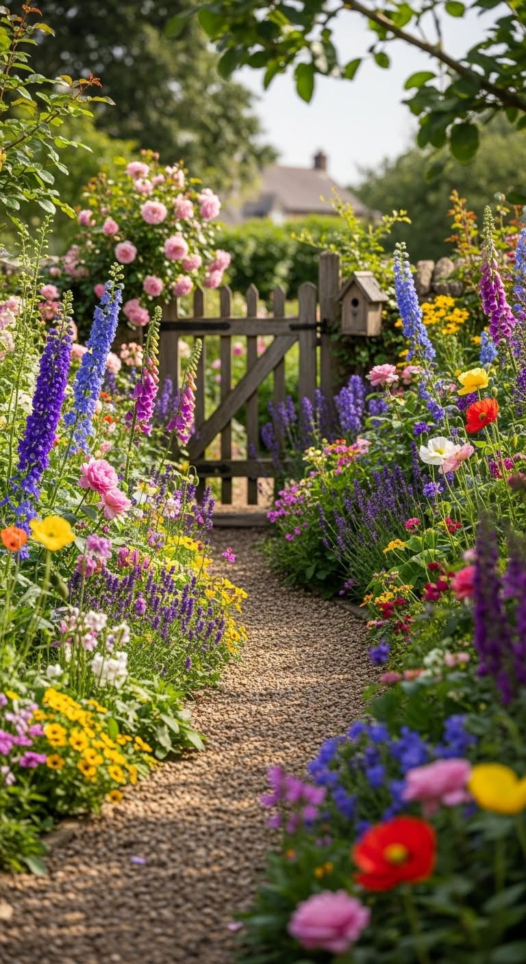 Cottage Style Garden Ideas | Gravel Path with Wood Gate and Mixed Flowers