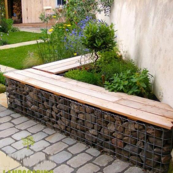 A simple wooden plank top provides a comfortable surface for sitting, making it practical as well as eye-catching. To build your own, secure a gabion basket, fill it with stones of your choice, and fasten treated wooden boards across the top.