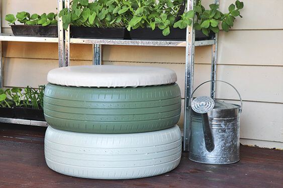 This clever garden seat shows how old tires can be turned into something fresh and functional. By stacking two tires, painting them in soft colors, and topping them with a cushioned seat, you instantly create a cozy stool.