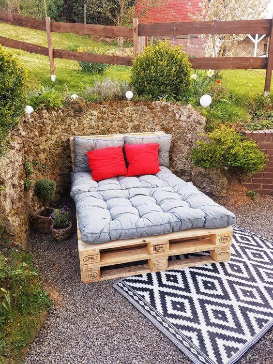 A pallet sofa is the ultimate backyard comfort hack, giving you a cozy retreat with hardly any cost. All you need are a few sturdy pallets stacked together for the base and backrest, then topped with thick cushions for softness.