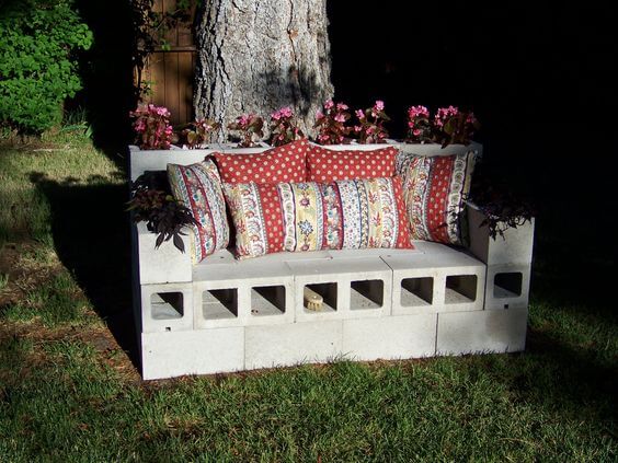 This garden seat doubles as a planter, making it both stylish and functional. The base is built with stacked cinder blocks, creating a strong structure that won’t budge.