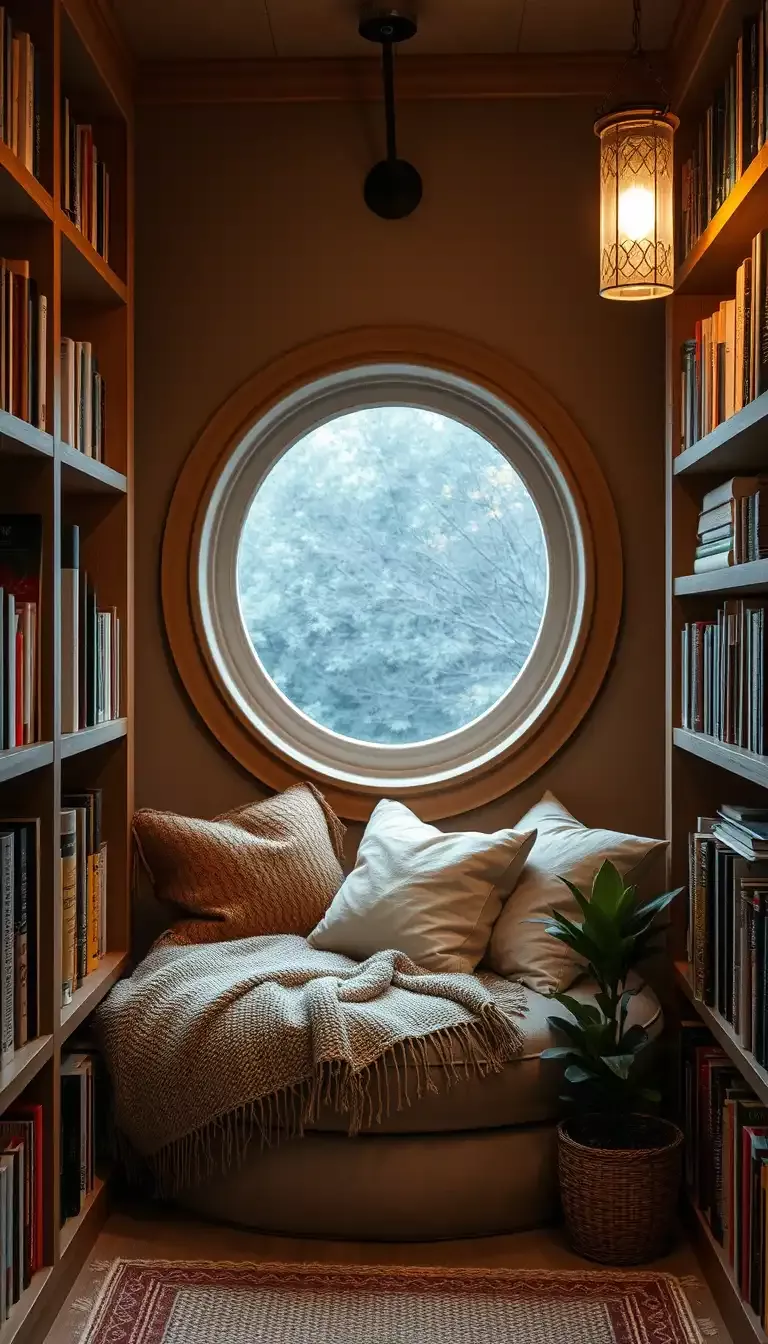 Cozy Library Nook with Round Window & Warm Lighting