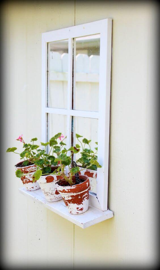 An old window door can be turned into a creative shelf with little effort. Mount a few wooden boards across its frame to create levels. Lean it against a wall or fix it in place for stability.