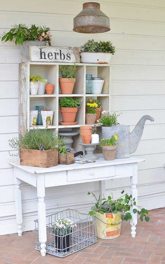 A potting bench shelf gives you a designated workspace outdoors. Build it with a flat tabletop and an upper shelf for storage. Keep your soil, tools, and pots neatly organized.