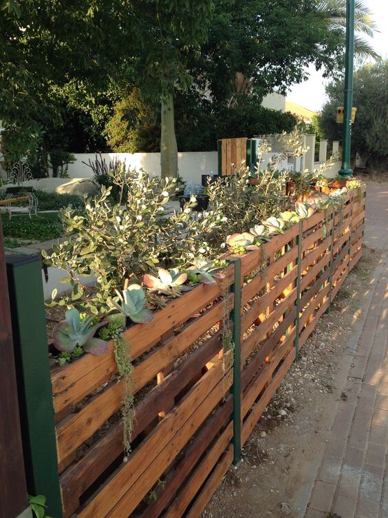 Here, a pallet fence doubles as a vertical succulent garden, creating living art. Each section of the pallet holds small pots or directly planted succulents. To make it, attach small containers or line the pallet with landscape fabric and soil.