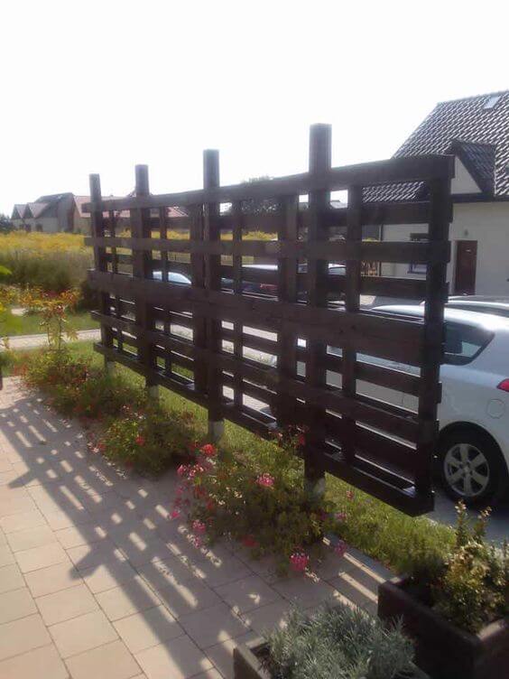 A simple brown-painted pallet fence adds warmth and a rustic feel to any backyard. The natural tone blends easily with gardens, creating a timeless look that’s easy to maintain.