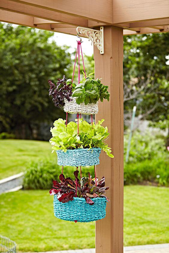 This three-tier rope basket garden’s a great solution for growing fresh herbs or leafy greens. Each layer is crafted from rope-covered baskets in bright tones, held together with sturdy cords and hung from a hook or beam.