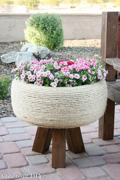 You can fill it with trailing flowers like petunias or calibrachoa to soften the edge and give it a fuller look. Start with a clean old tire, wrap it tightly with rope using hot glue, and then add a wood stand or reuse an old table base for support.