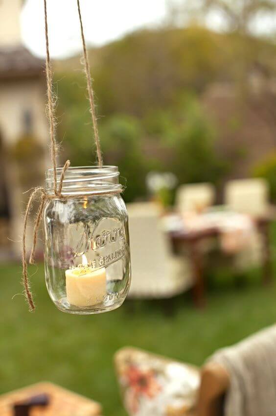 A mason jar, a bit of twine, and a tealight candle are all you need. It hangs easily from a tree branch or pergola beam and adds a cozy touch to backyard dinners or evening gatherings.