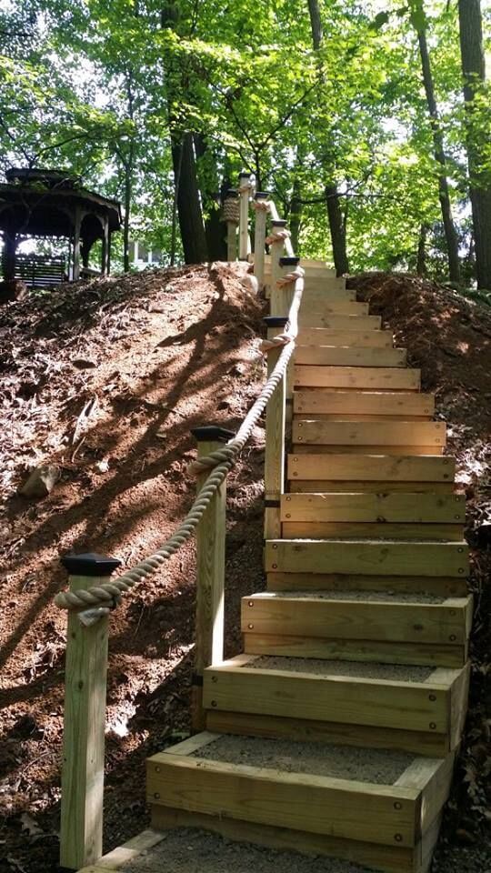 The thick rope handrail, secured to wooden posts, adds both function and rustic charm. This setup works well in natural landscapes where you want to blend practicality with a handmade feel. Ideal for cabins, garden trails, or backyard slopes.