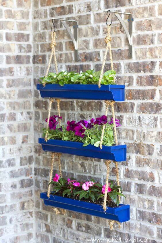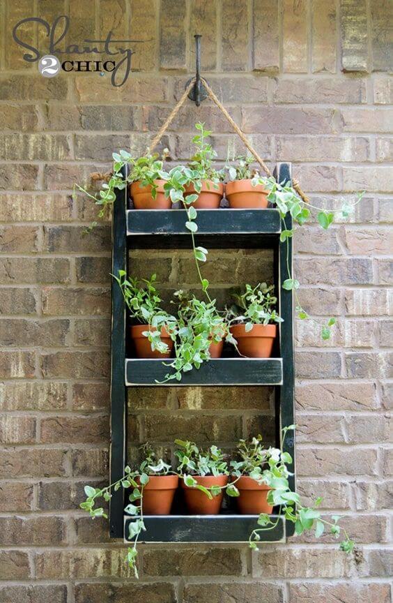 To make it, wrap woven rope around plastic containers, attach them securely using rope or chain, and hang from a bracket or pergola post. Fill each level with lightweight soil and plants that thrive in partial sunlight.