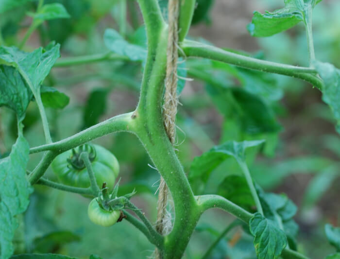 Step 2: Gently wrap the other end around the tomato stem, giving support without pinching the plant.