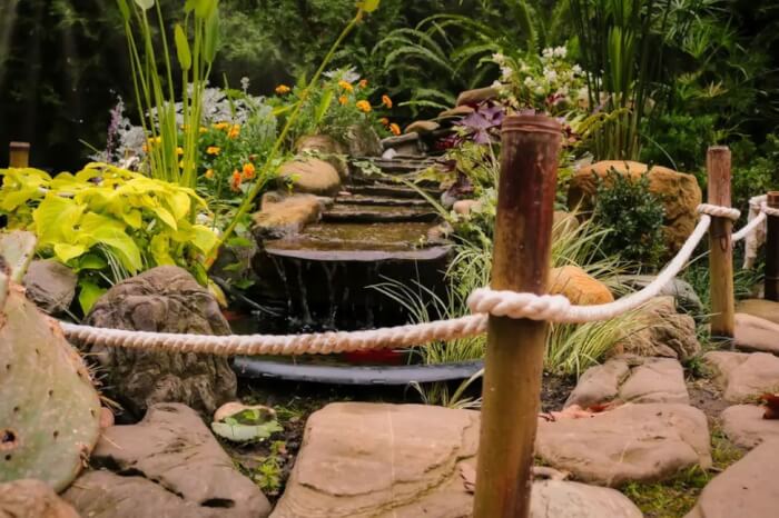 This elegant garden setup uses thick rope and rustic wooden posts to subtly guide visitors along a stone pathway while framing a tranquil waterfall.
