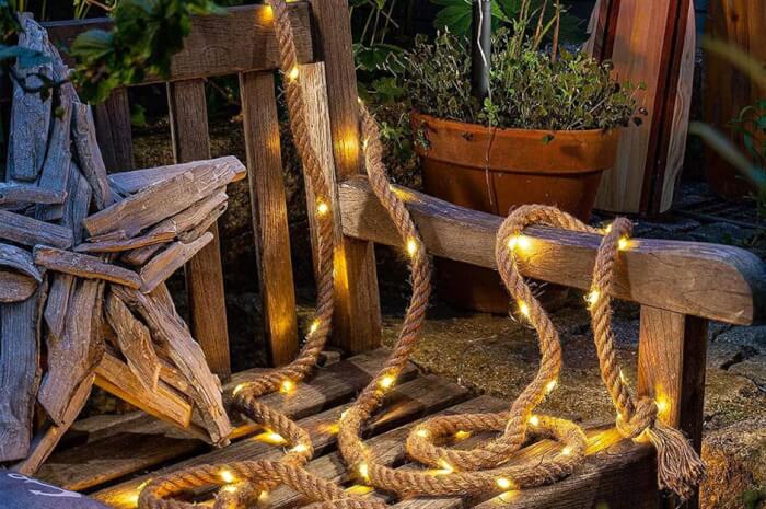 This cozy setup blends natural texture with soft lighting using thick rope entwined with warm fairy lights. Draped over a wooden bench and around nearby decor, it creates a warm and welcoming glow perfect for evening relaxation.